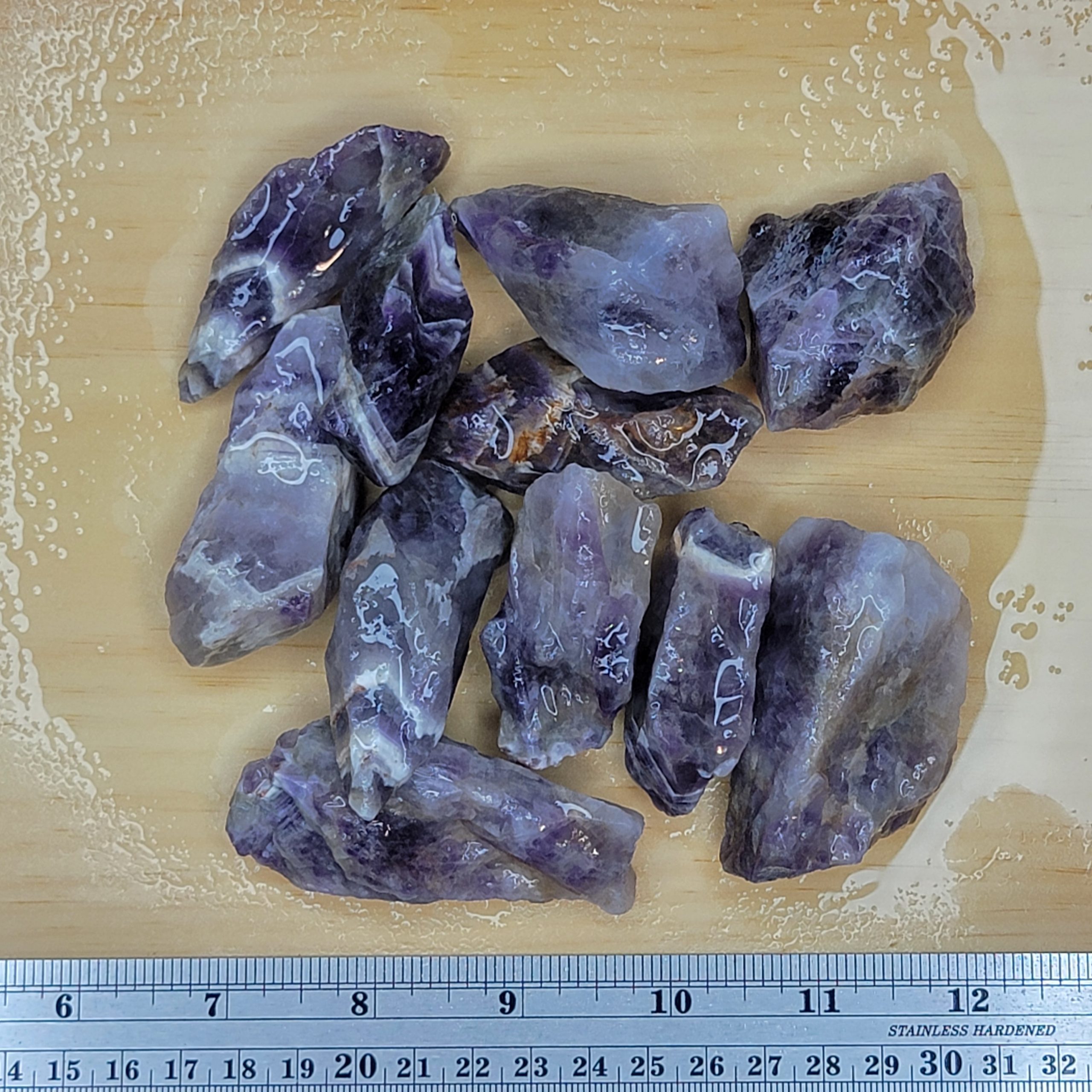 Chevron Amethyst rough. Approx. 1 lb shown, dry and wet to highlight colors and patterns.