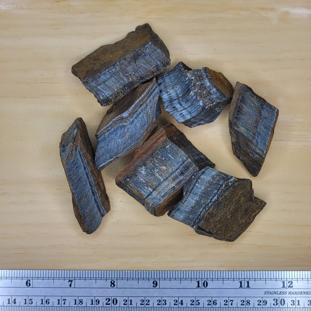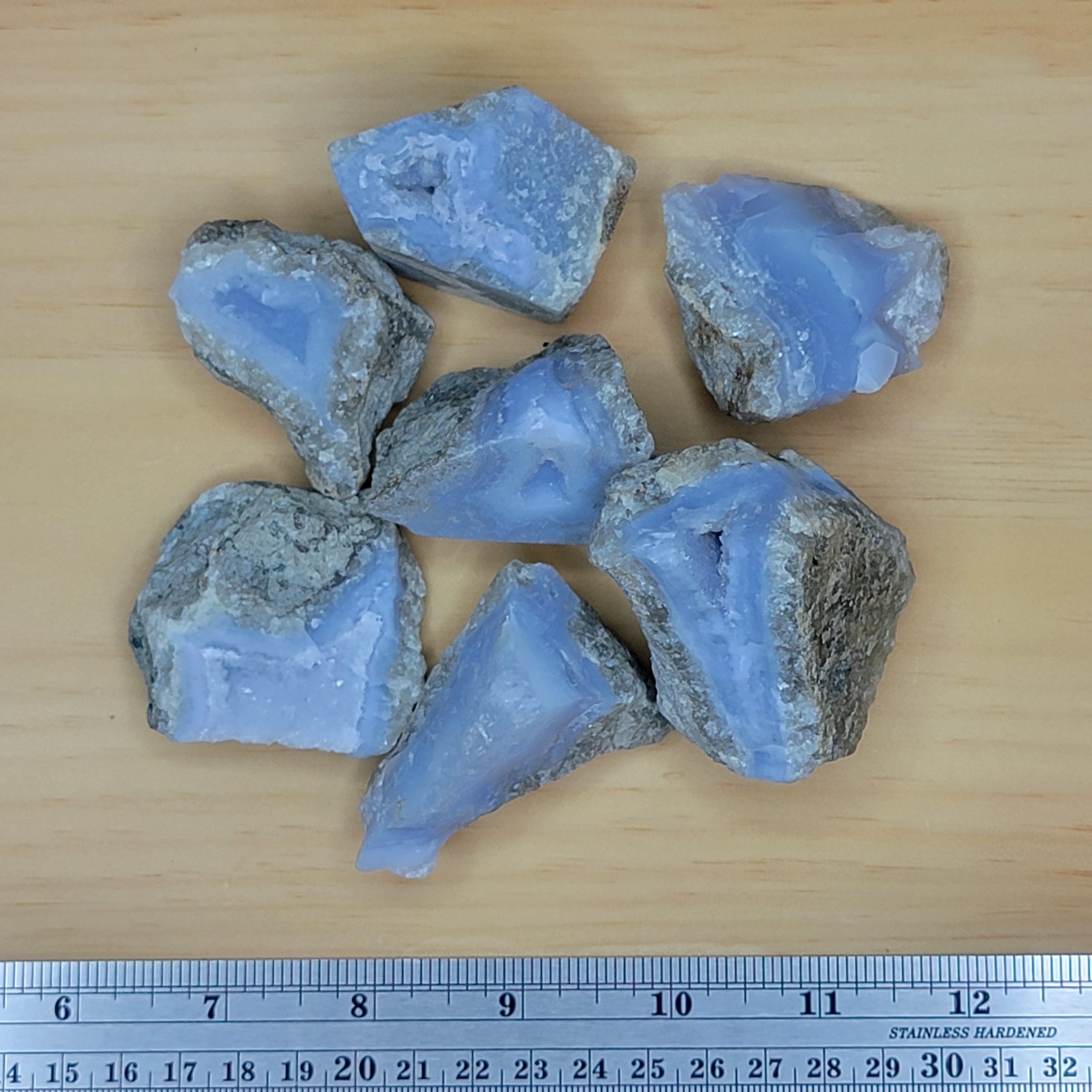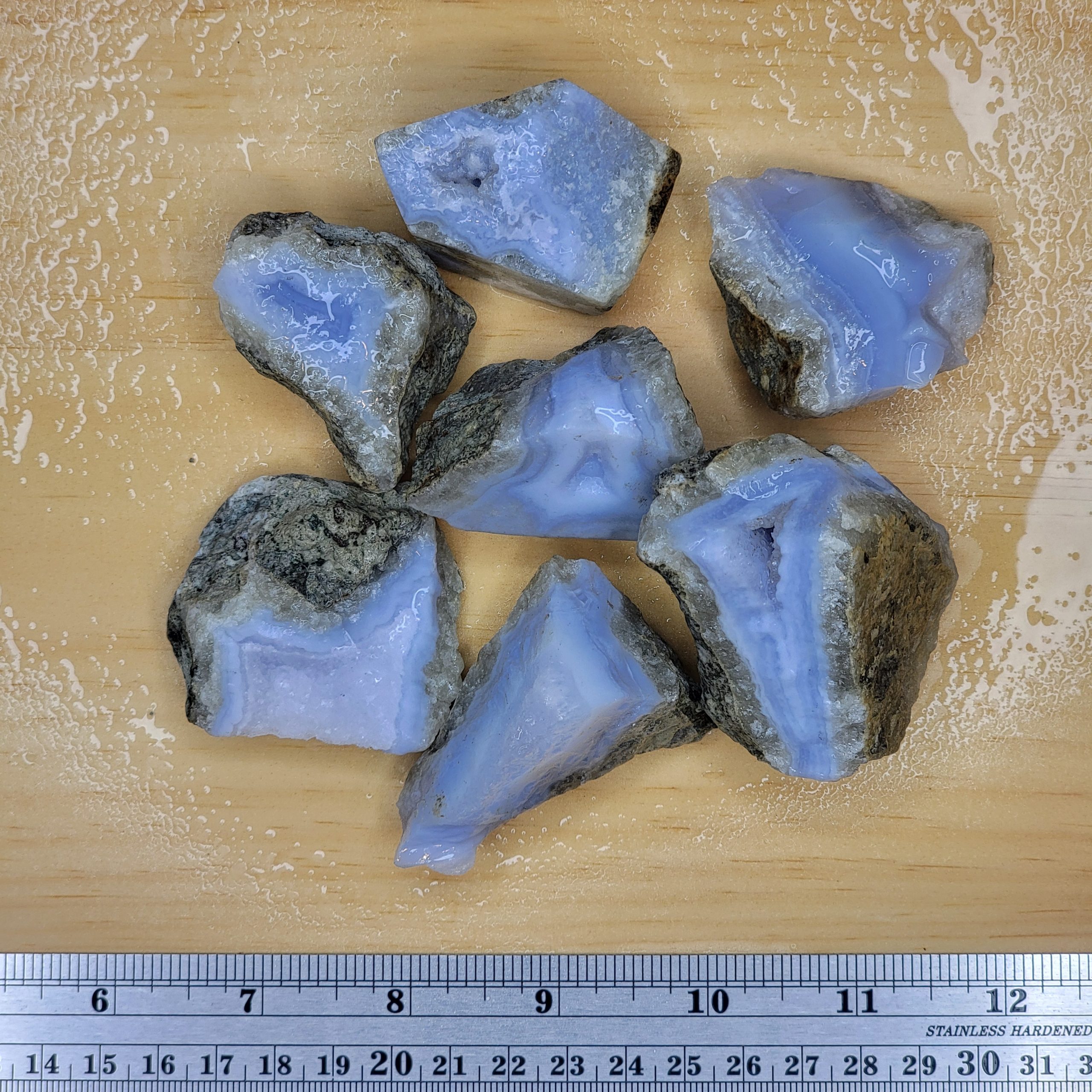 Blue Lace Agate rough. Approx. 1 lb shown, dry and wet to highlight colors and patterns.