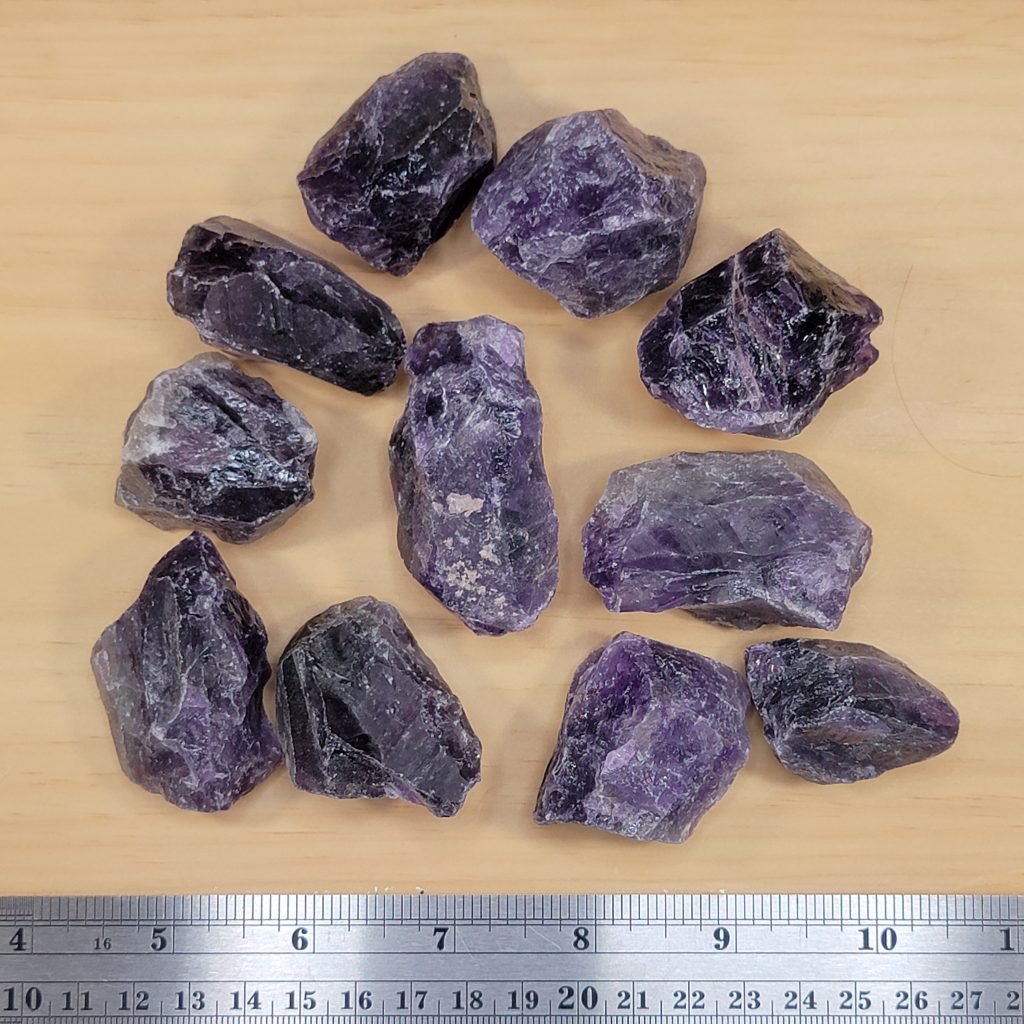 Chevron Amethyst rough. Approx. 1 lb shown, dry and wet to highlight colors and patterns.