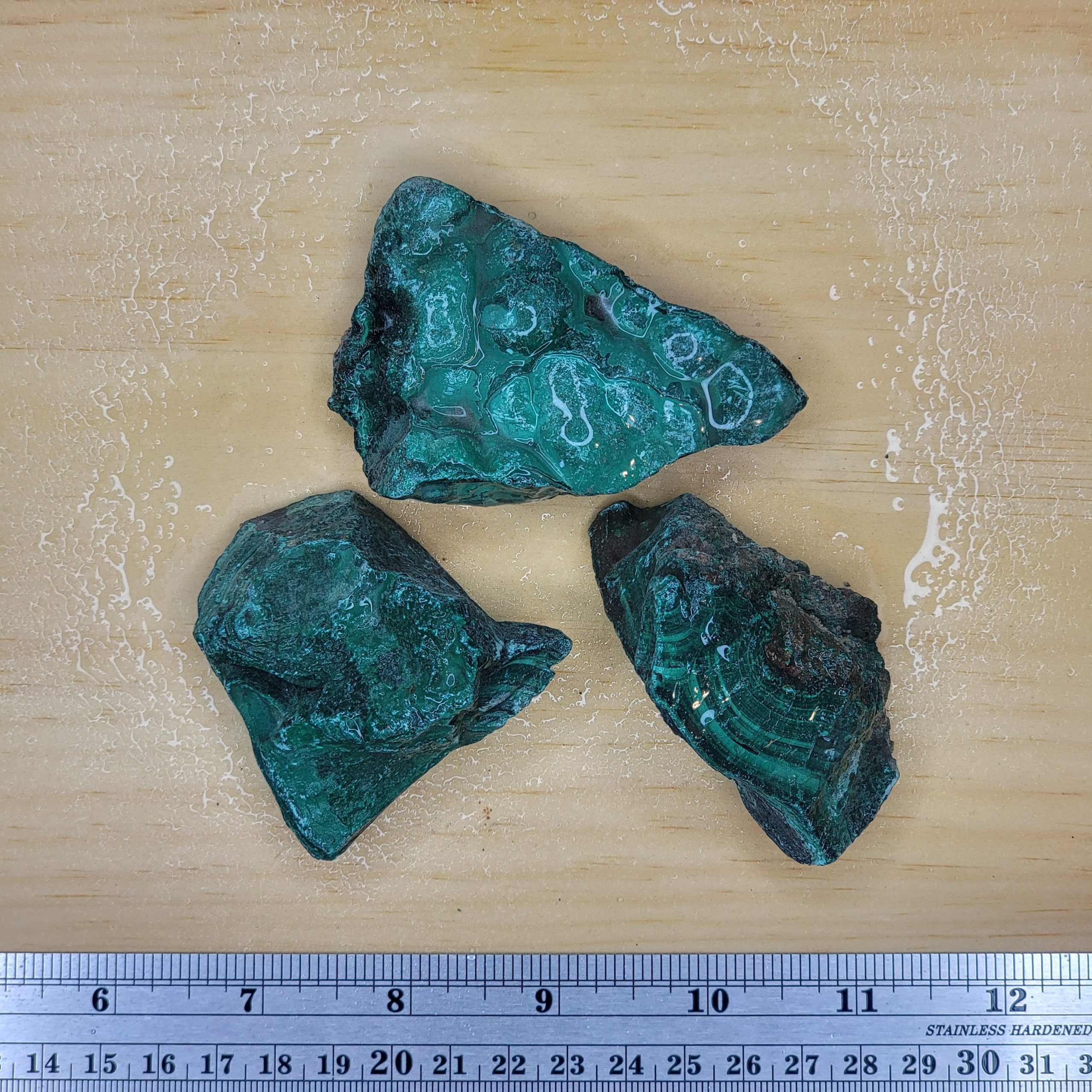 Malachite rough. Approx. 1 lb shown, dry and wet to highlight colors and patterns.