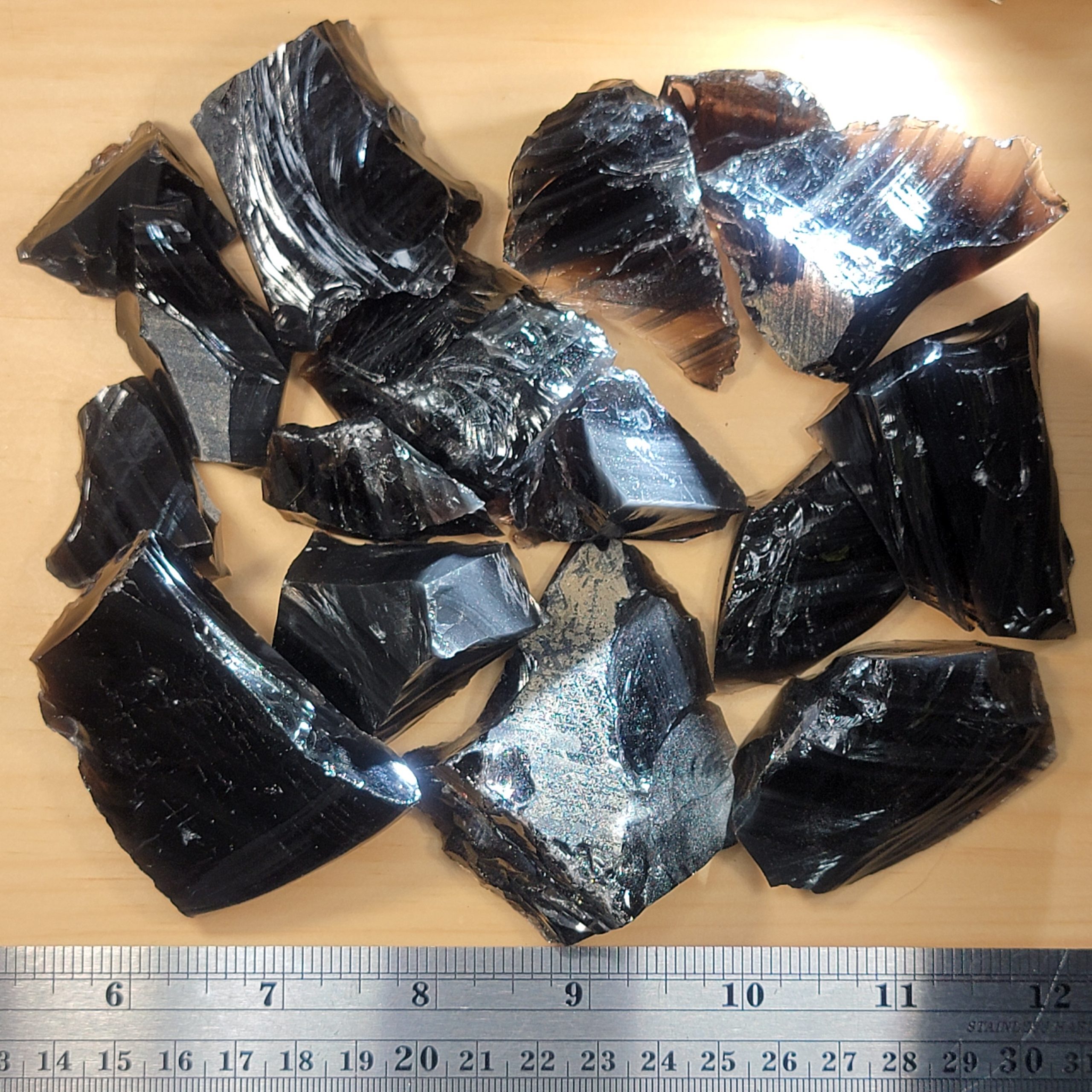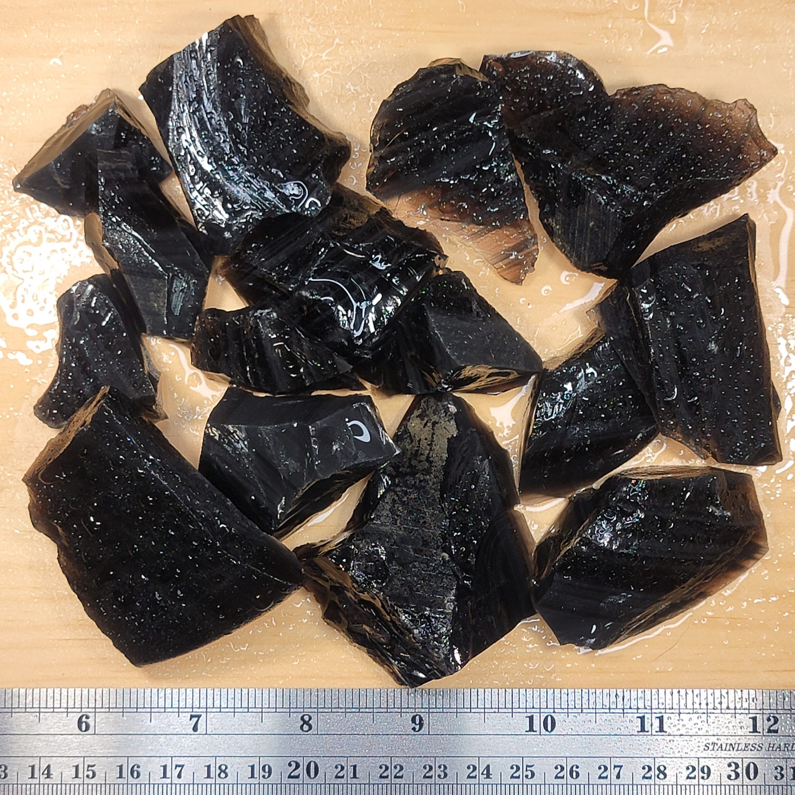 Midnight Lace Obsidian Rough. Approx. 1 lb shown, dry and wet to highlight colors and patterns.