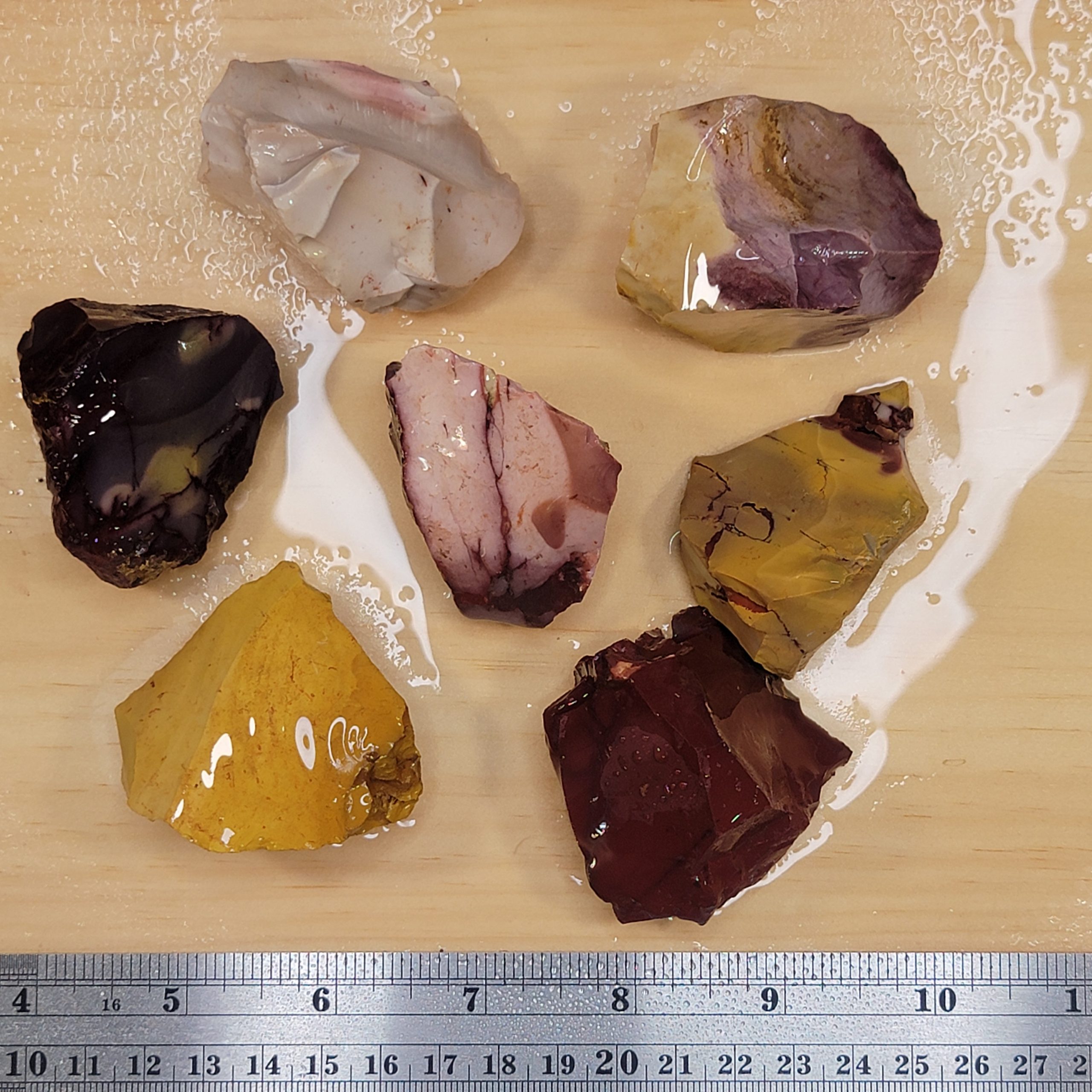 Mookaite rough. Approx. 1 lb shown, dry and wet to highlight colors and patterns.