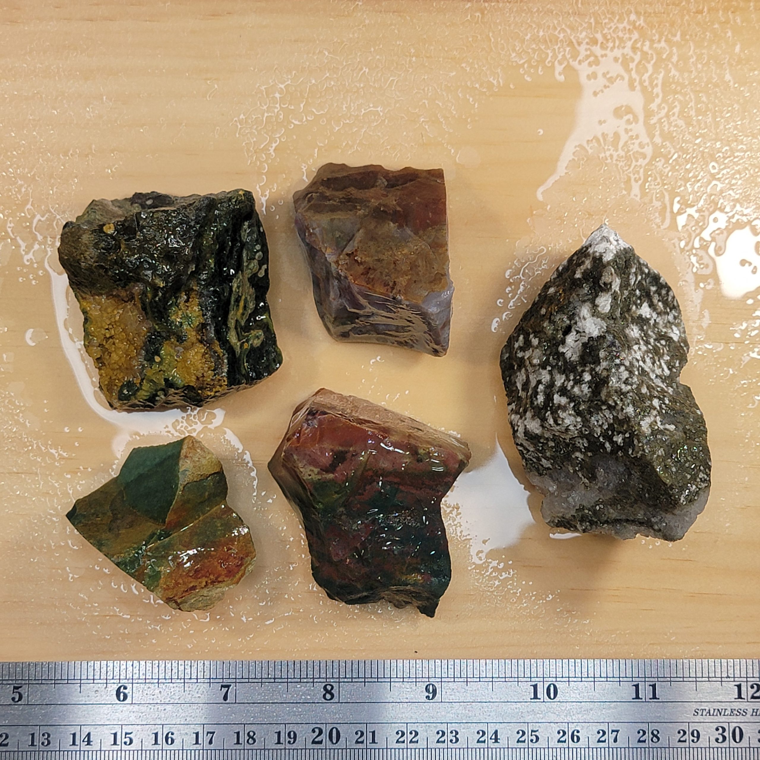 Sea Jasper rough. Approx. 1 lb shown, dry and wet to highlight colors and patterns.