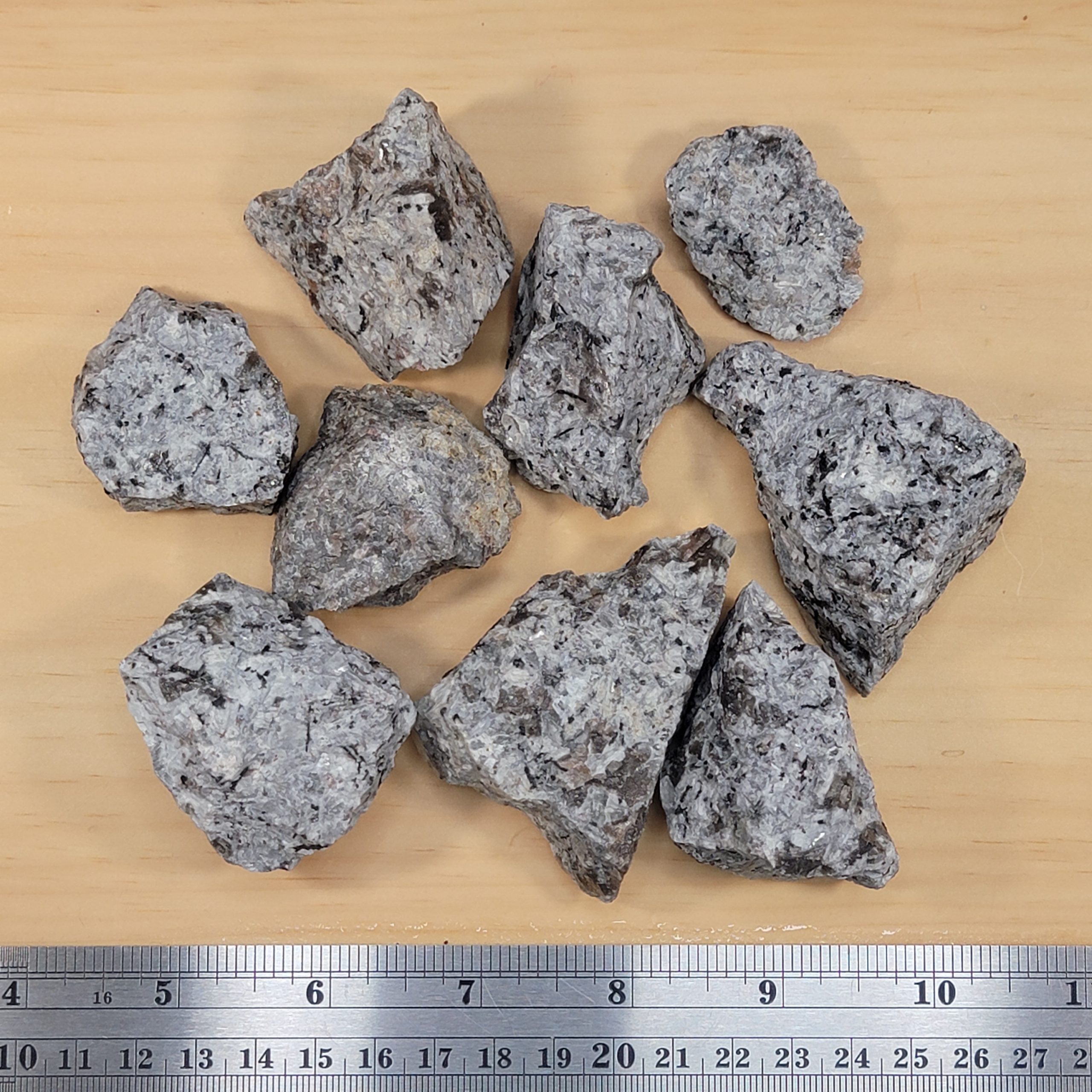 Sodium-Syenite rough. Approx. 1 lb shown with standard lighting and UV 365nm, dry and wet to highlight colors and patterns.